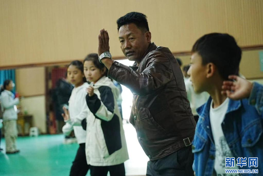 7月23日,洛桑扎西向小演员传授藏戏表演肢体动作。新华网发姚翔硕摄