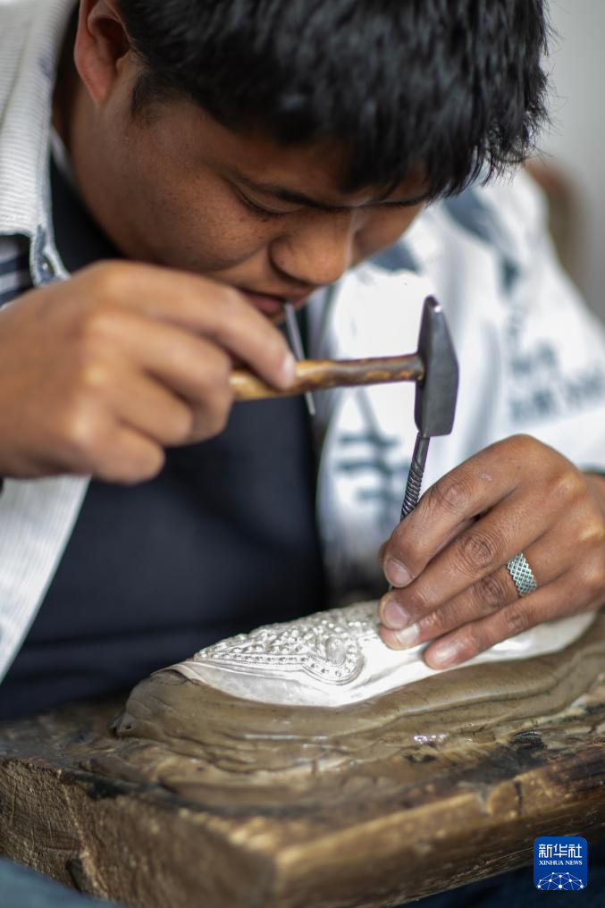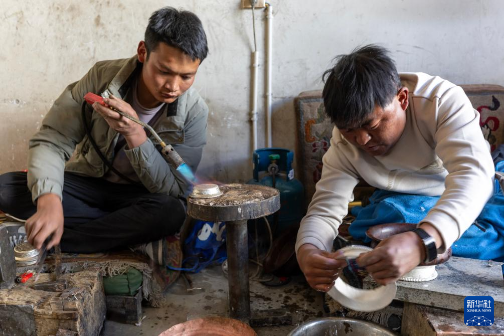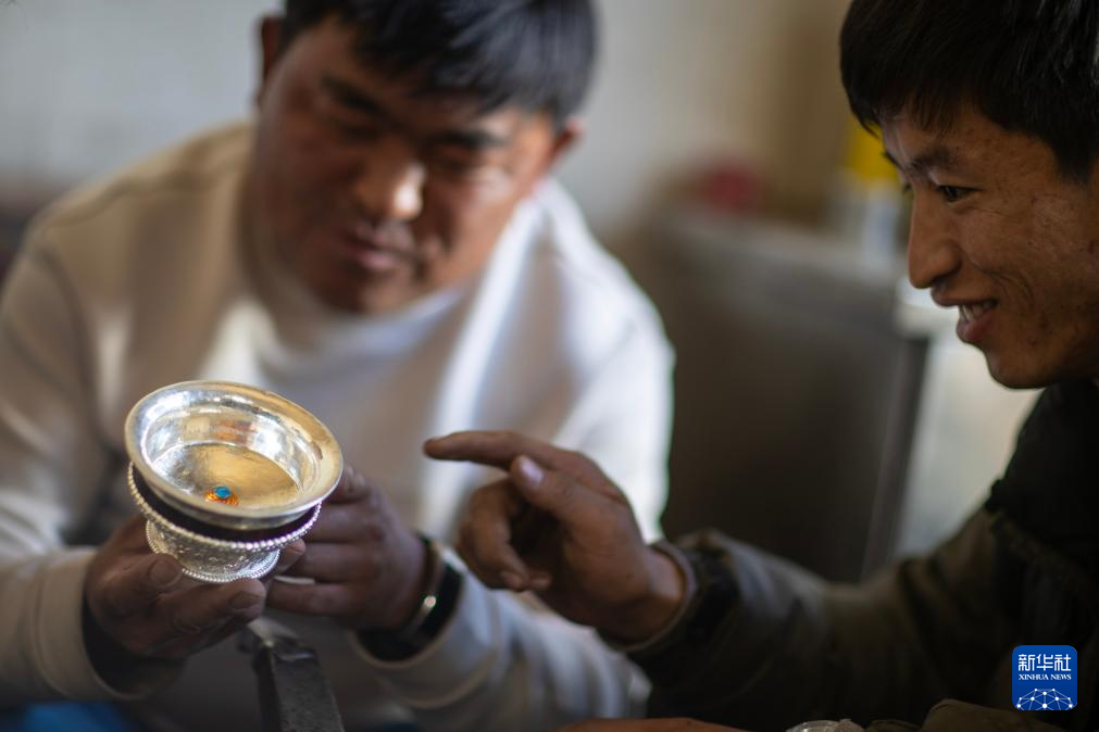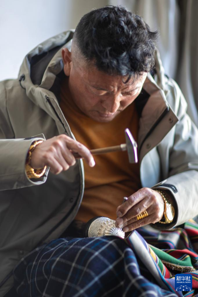 3月6日,扎西吉彩的手工匠人在给银器塑形。新华社记者姜帆摄