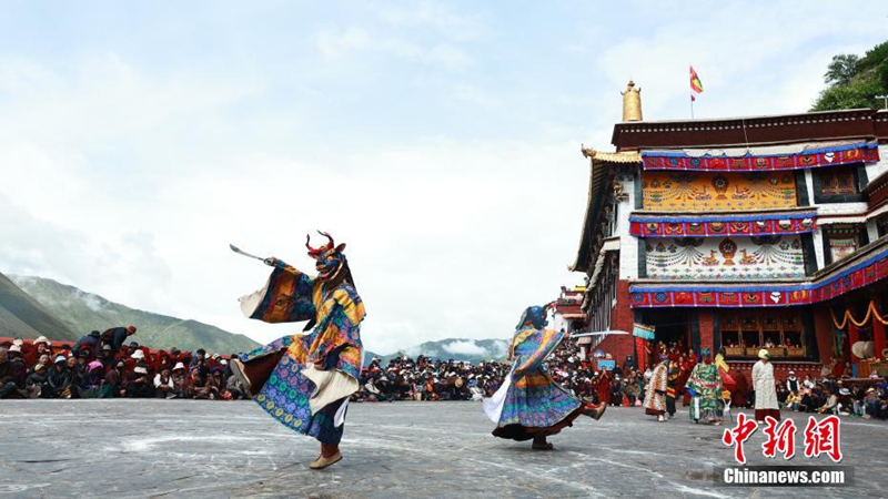 近日,西藏自治区拉萨市墨竹工卡县直孔替寺举行中国国家级非物质文化遗产直孔嘎尔羌姆(跳神)活动。直孔嘎尔羌姆是藏传佛教重要的宗教舞蹈艺术形式,“嘎尔”意为“乐舞”。其表演具有规范化的舞蹈动作、独特的伴奏音乐和完整的仪轨流程。图为西藏拉萨市墨竹工卡县直孔替寺僧人们佩戴面具参加跳神活动。