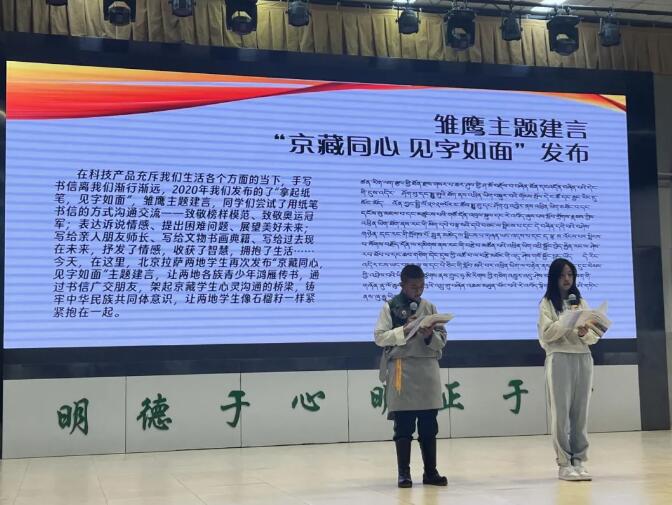 笺短情长,见字如面。一人,一笔,一封信,一段故事。长期以来,促进各族青少年学生交往交流交融,是北京教育援藏发挥资源优势的又一重要举措。北京教育援藏借鉴北京市“拿起纸笔、见字如面”活动经验,积极开辟教育援藏新赛道。2023年8月,北京教育援藏“雏鹰爱心行动-拉萨行”活动启动。期间,京藏两地学生代表共同发布“京藏同心,见字如面”雏鹰主题建言,号召两地青少年通过书信广交朋友,架起京藏学生心灵沟通的桥梁。截至目前,京藏51所学校3000余对学生参加京藏同心、见字如面书信交友,并建立友好班级、友好年级和友好学校。两地各族学生通过书信增进了解、广交朋友,畅谈学习生活体会、介绍家乡发展变化,抒发对伟大祖国的无限热爱,牢固树立休戚与共、荣辱与共、生死与共、命运与共的共同体理念,像石榴籽一样紧紧抱在一起。2024年,全国政协委员以此活动为典型案例向全国政协会议提交了《关于促进其他省份与西藏青少年交往交流交融的提案》,得到中央统战部和国家民委相关部门关注。
