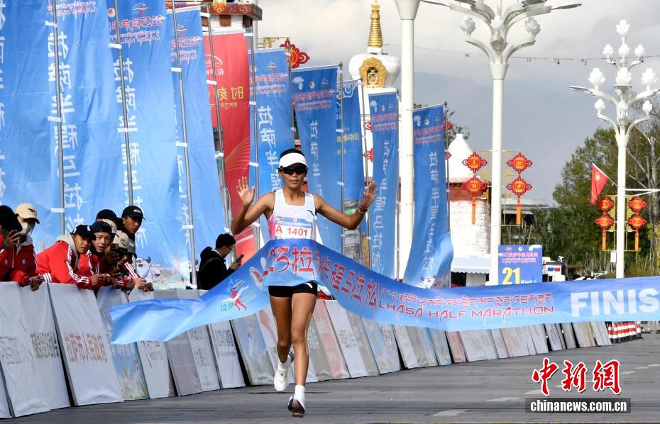 9月21日,2025拉萨半程马拉松在西藏自治区会展中心鸣枪开跑。本次赛事设置半程马拉松(21.0975公里)、竞速跑(10公里)和健康跑(5公里)三个组别,参赛规模7000人。图为半程马拉松女子组第一名央增拉姆冲破终点线瞬间。中新社记者 李林 摄