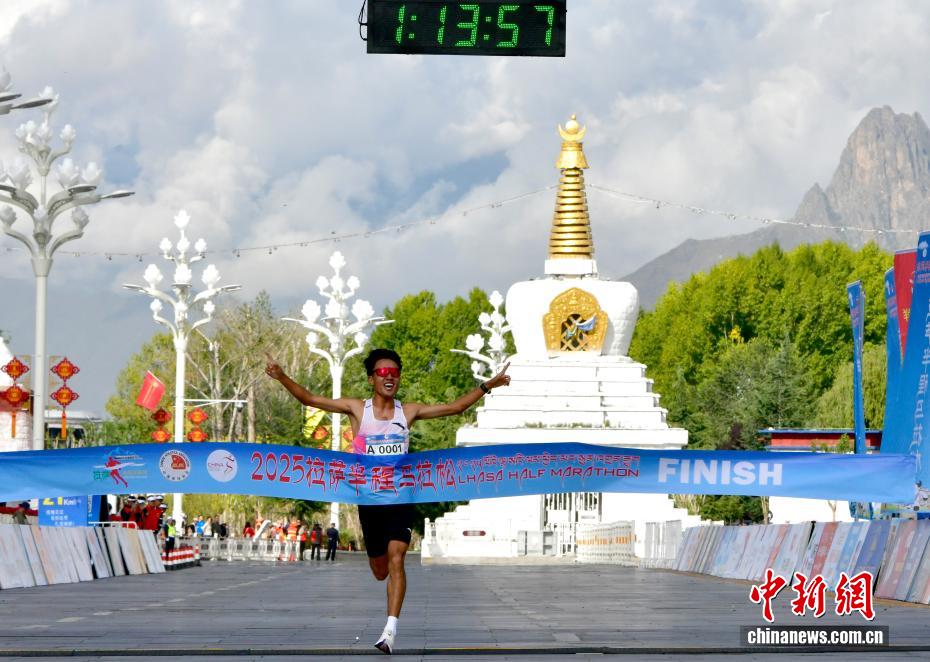 9月21日,2025拉萨半程马拉松在西藏自治区会展中心鸣枪开跑。本次赛事设置半程马拉松(21.0975公里)、竞速跑(10公里)和健康跑(5公里)三个组别,参赛规模7000人。图为半程马拉松男子组第一名顿珠次仁冲破终点线瞬间。中新社记者 李林 摄