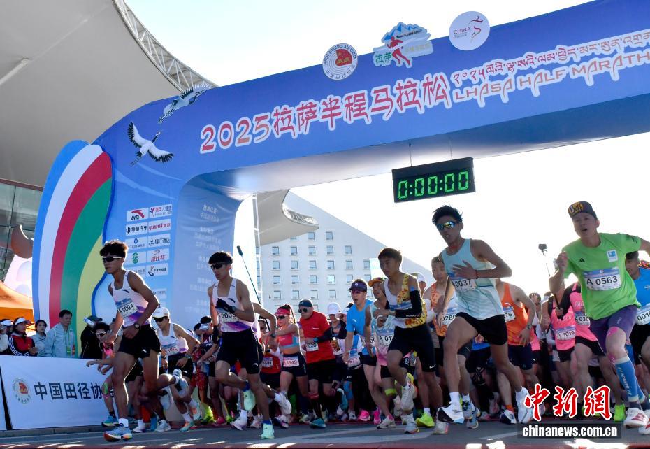 9月21日,2025拉萨半程马拉松在西藏自治区会展中心鸣枪开跑。本次赛事设置半程马拉松(21.0975公里)、竞速跑(10公里)和健康跑(5公里)三个组别,参赛规模7000人。图为2025拉萨半程马拉松鸣枪开跑。中新社记者 李林 摄
