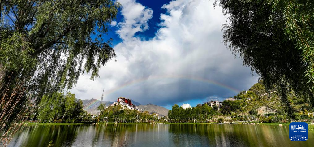 从拉萨团结公园远眺彩虹下的布达拉宫(9月21日摄)。新华社记者晋美多吉摄