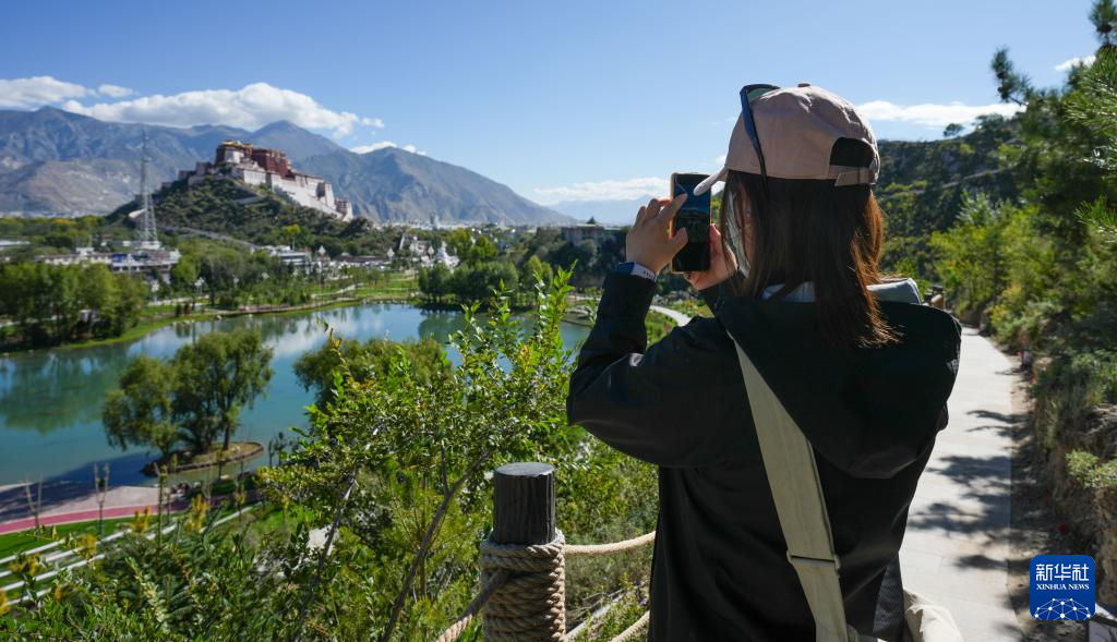 9月25日,在拉萨团结公园旁的药王山步行道上,一名游客拍摄美景。新华社记者晋美多吉摄