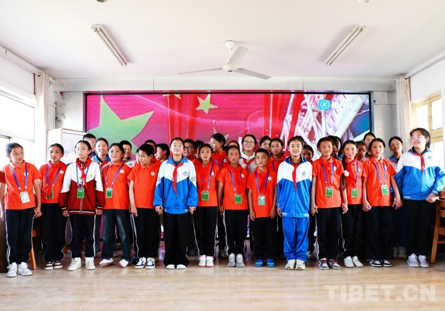 图为西藏阿里噶尔县孔繁森小学和山东聊城堂邑镇中心小学的孩子们合唱中国少年先锋队队歌《我们是共产主义接班人》摄影:刘莉