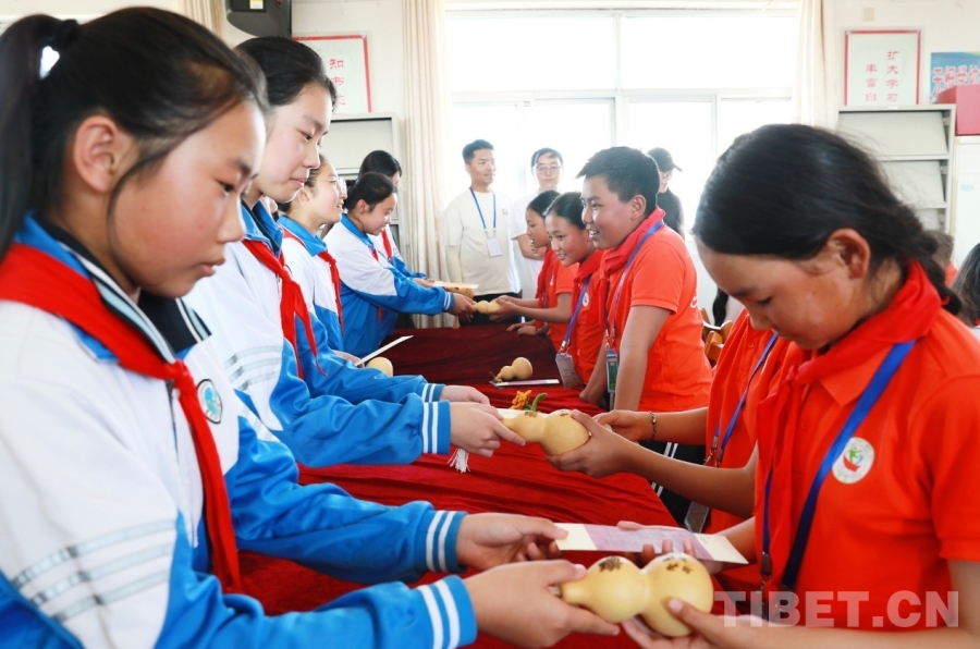 图为堂邑镇中心小学学生向西藏阿里噶尔县孔繁森小学学生赠送小礼物摄影:刘莉