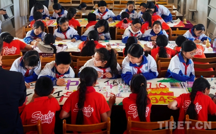 图为西藏、山东小朋友共同绘制迎国庆主题长卷摄影:刘莉