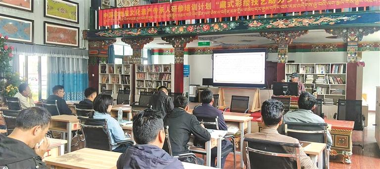 加措在“藏式彩绘技艺助力乡村振兴技能研修班”中为学员讲解传统藏式木雕和彩绘技艺。记者格桑伦珠摄