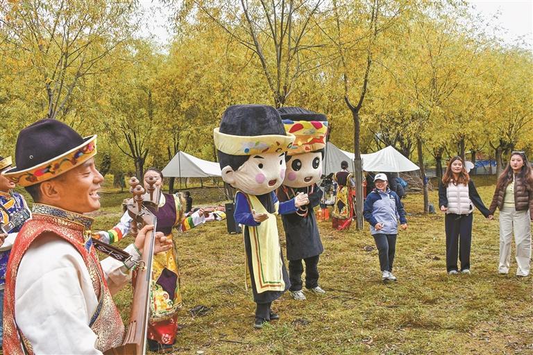 图为徒步爱好者与“NPC”角色开展歌舞互动游戏。记者刘枫摄
