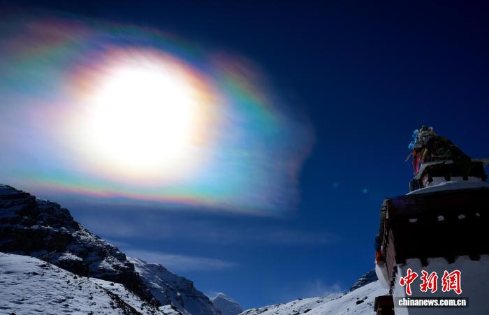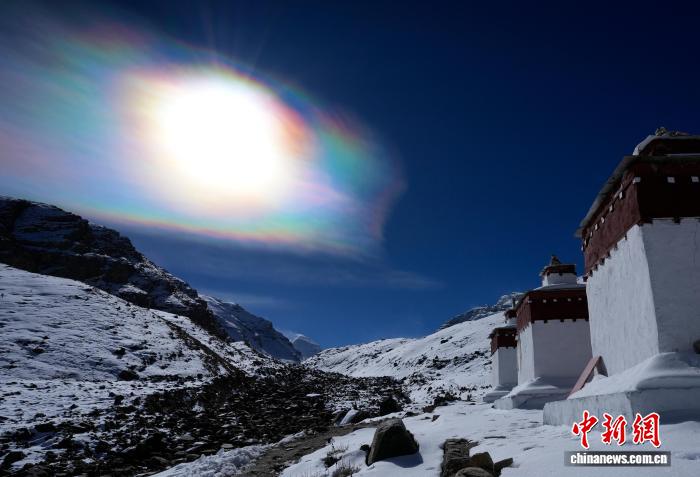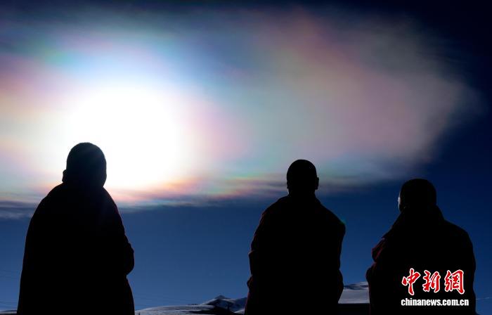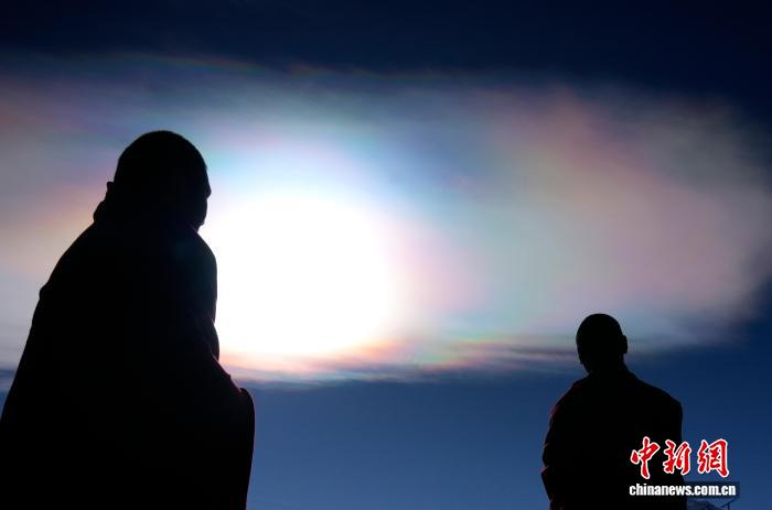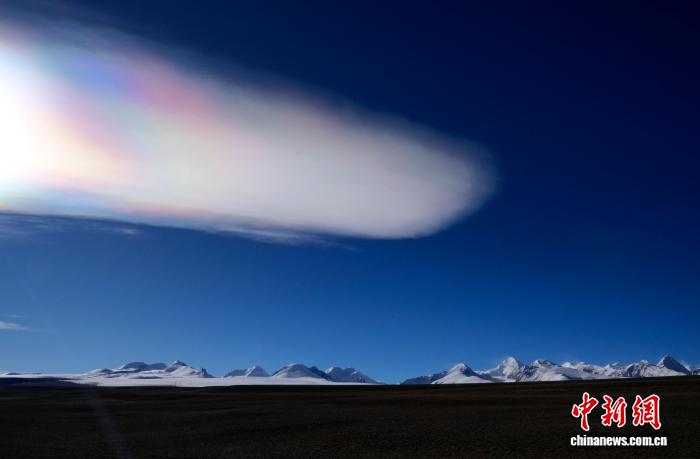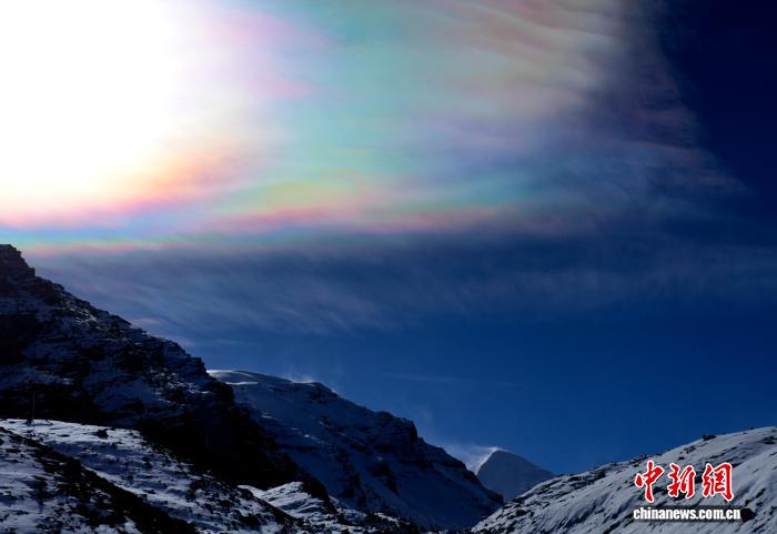 11月5日上午,西藏日喀则市岗巴县天空中出现“七彩祥云”景观。据了解,“七彩祥云”又叫“七彩云”“虹彩云”,是指太阳光线与云彩中的冰晶结构产生的自然现象。中新社记者李林摄