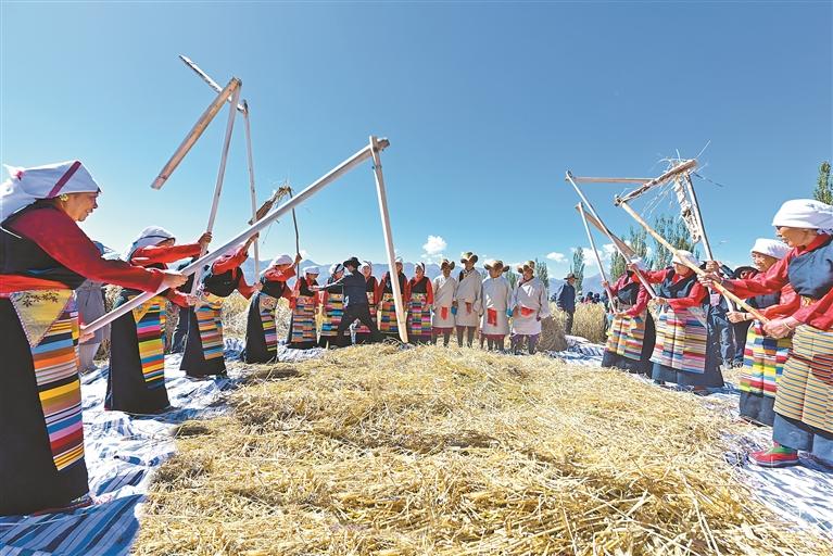 图为深秋时节,在拉萨市林周县强嘎乡典冲村,当地农民用传统方式打场(资料图片)。记者王敏摄
