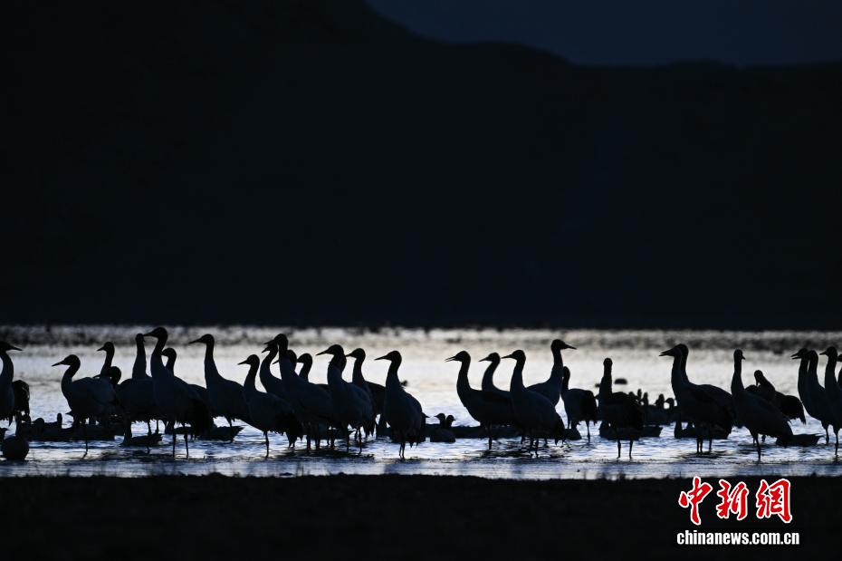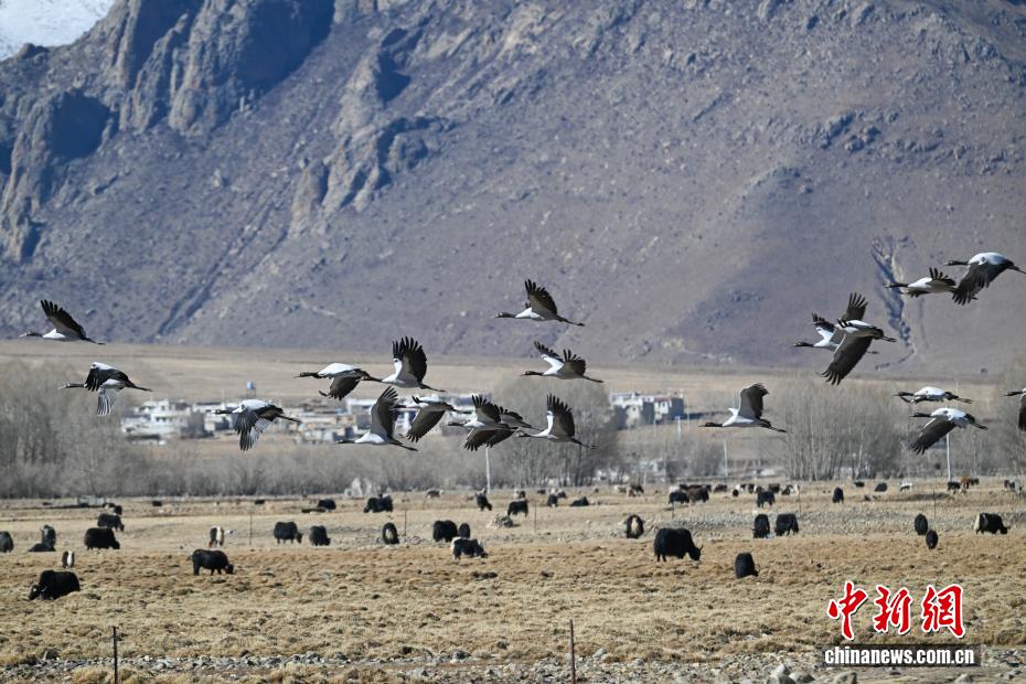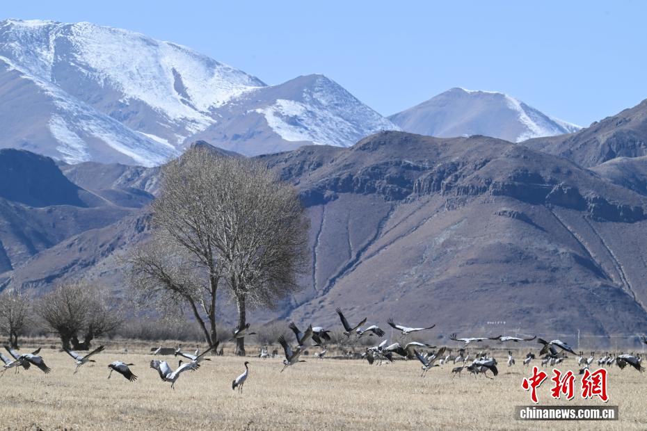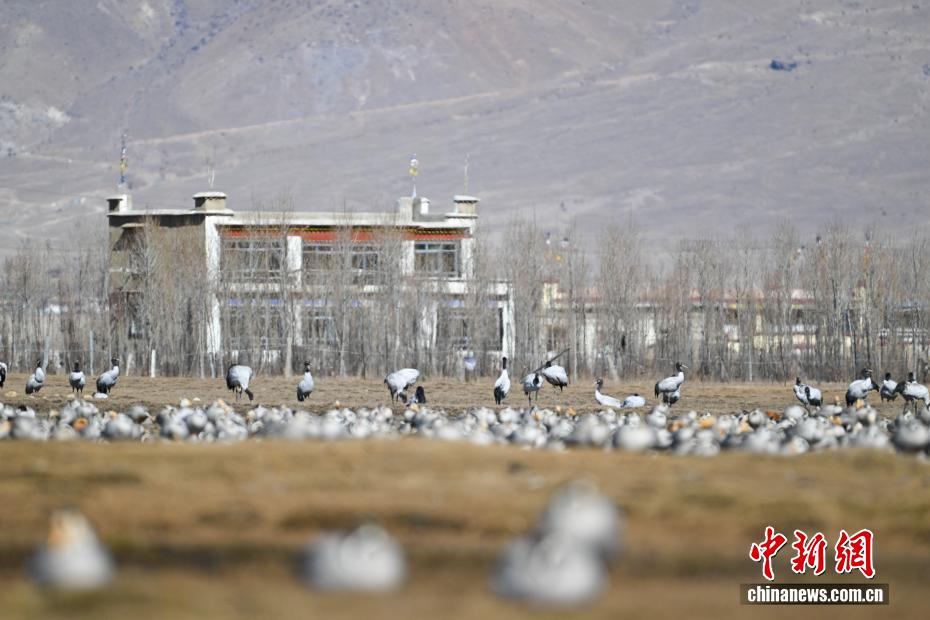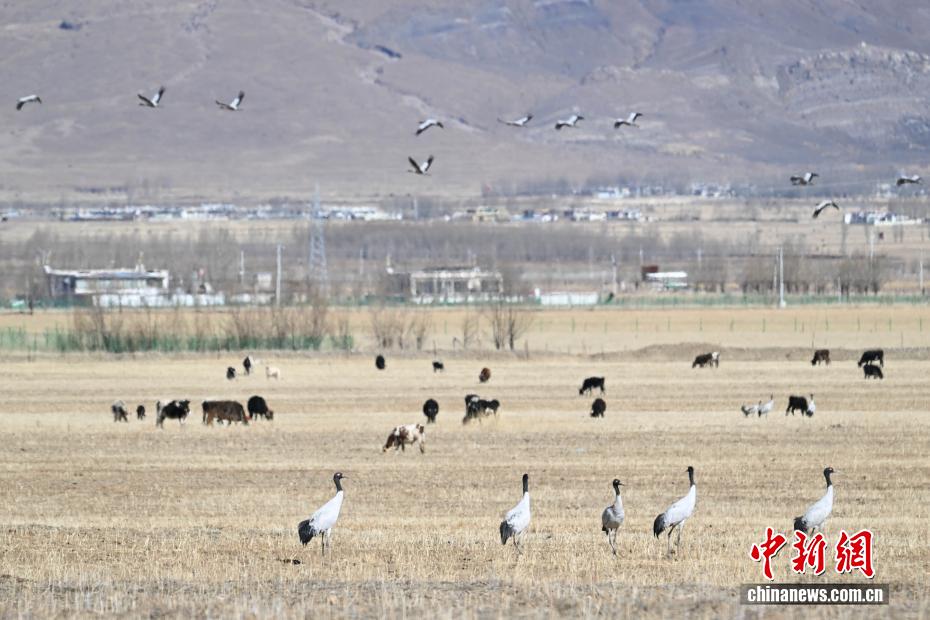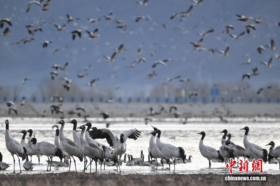 11月26日,位于西藏自治区拉萨市林周县的黑颈鹤自然保护区内,大量越冬的黑颈鹤在卡孜水库、农田、湿地里觅食、嬉戏。林周县位于拉萨河上游及澎波河流域,是黑颈鹤的主要越冬地之一。中新社记者贡嘎来松摄