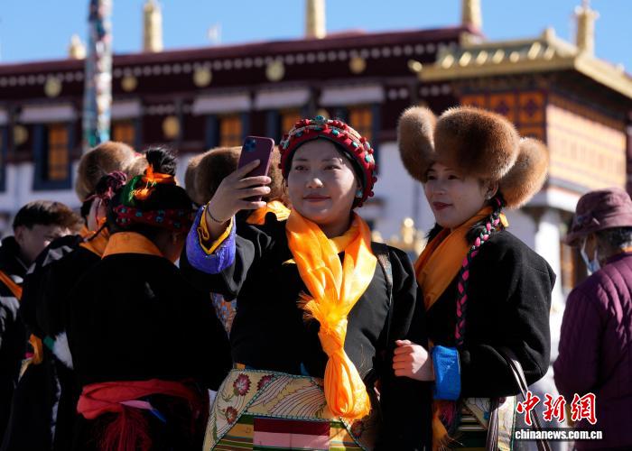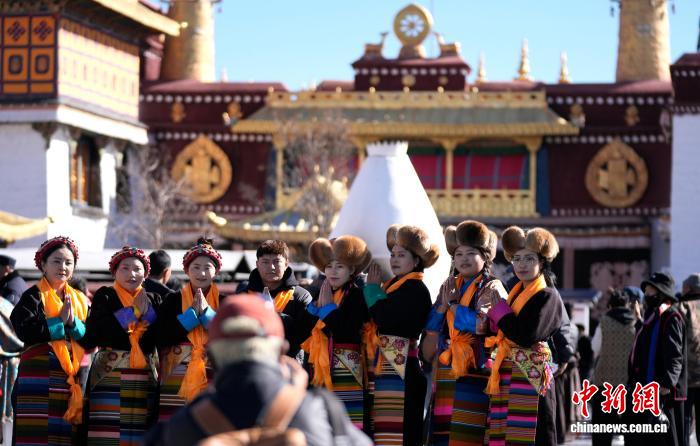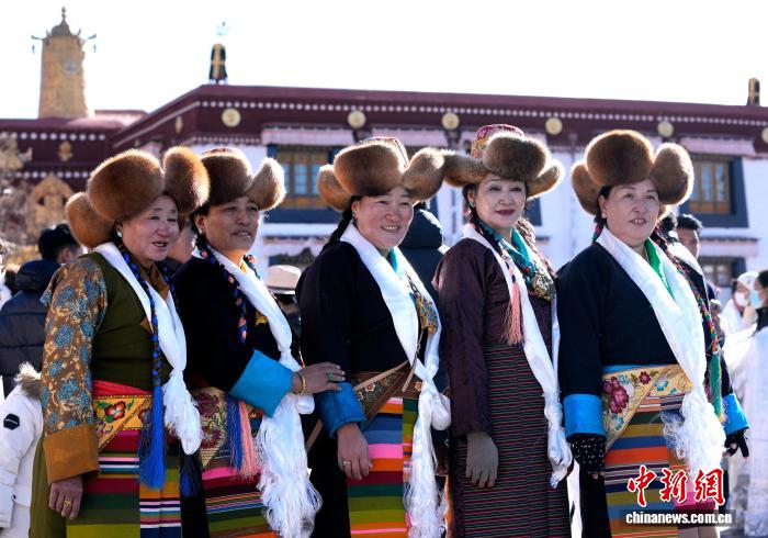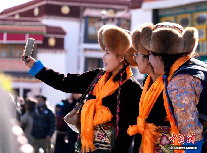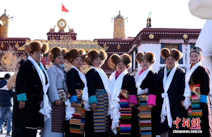 图为拉萨妇女盛装在大昭寺广场拍照。中新社记者李林摄