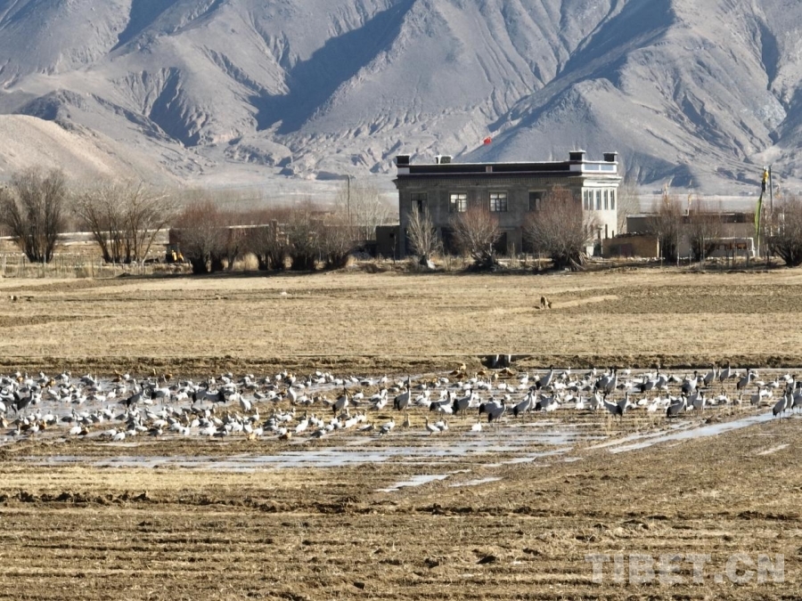 图为南木林县艾玛乡周边黑颈鹤在田间集群栖息