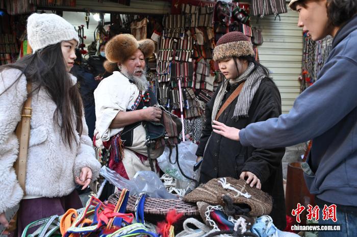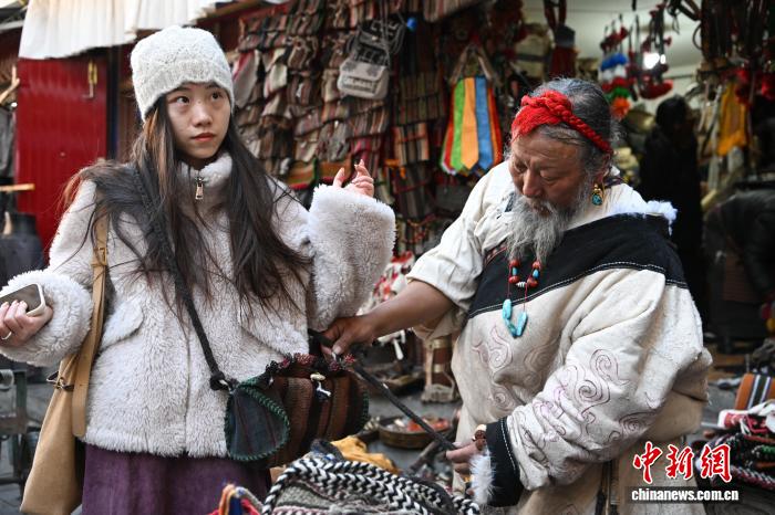 12月9日,西藏拉萨市八廓街冲赛康旁的背阴巷口,55岁店主次仁罗布的藏式老物件小店热闹非凡。不足30平方米的空间里,乌朵、马包、藏式氆氇侧挂包等好物琳琅满目,既有时光沉淀的老物件,也有手艺人新制精品。小店吸引本地民众、年轻人及游客纷纷选购,生意红火。图为游客选购藏式氆氇侧挂包。中新社记者贡嘎来松摄