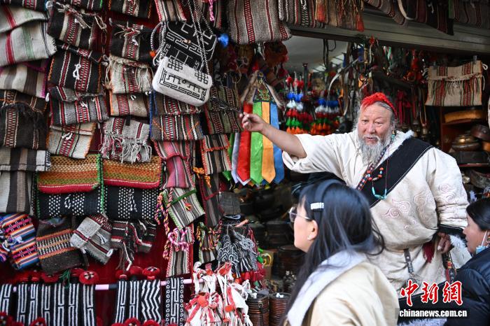 图为藏式老物件店主次仁罗布向游客推荐藏式氆氇侧挂包。中新社记者贡嘎来松摄