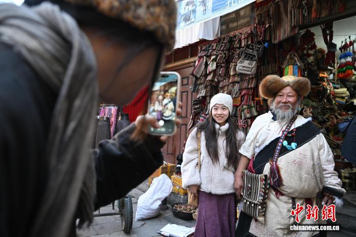 图为藏式老物件店主次仁罗布与游客合影。中新社记者贡嘎来松摄