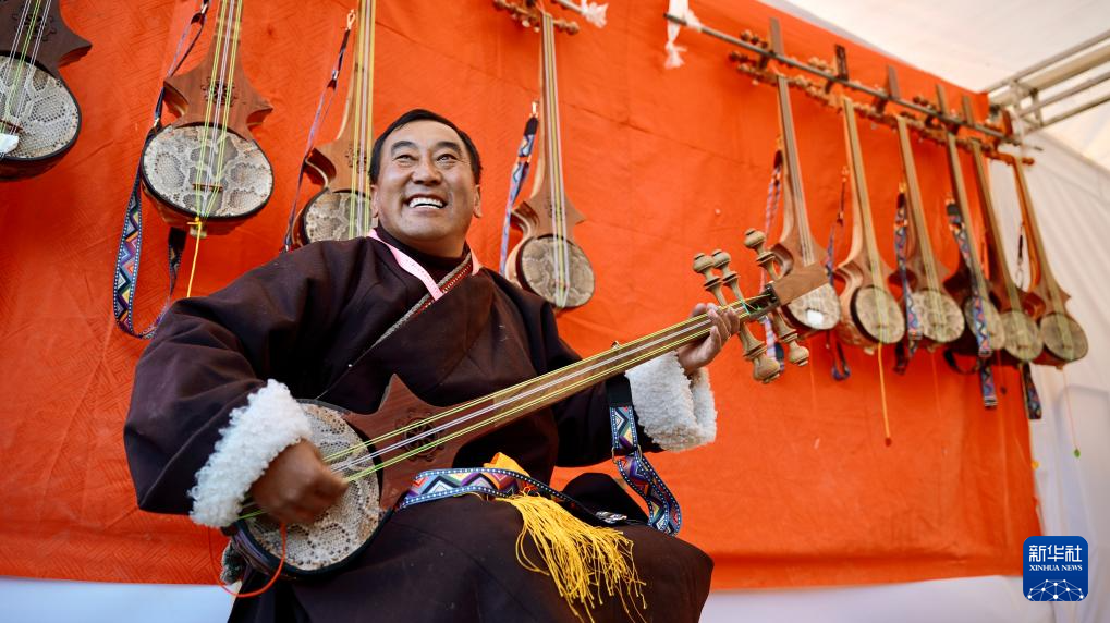 12月2日,洛桑曲扎在雅砻物资交流会现场弹奏扎念琴。(周昱龙摄)