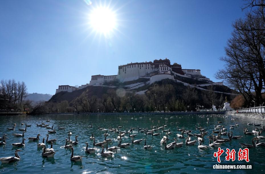 12月17日,西藏拉萨市区宗角禄康公园,大批斑头雁“集结”越冬。成群结队的斑头雁等越冬候鸟吸引市民游客驻足观赏、拍照留念。图为宗角禄康公园越冬的斑头雁。