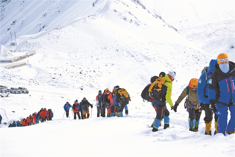 图为5月2日,登山爱好者向洛堆峰峰顶进发(资料图片)。本报记者潘多郑璐明吉摄影报道