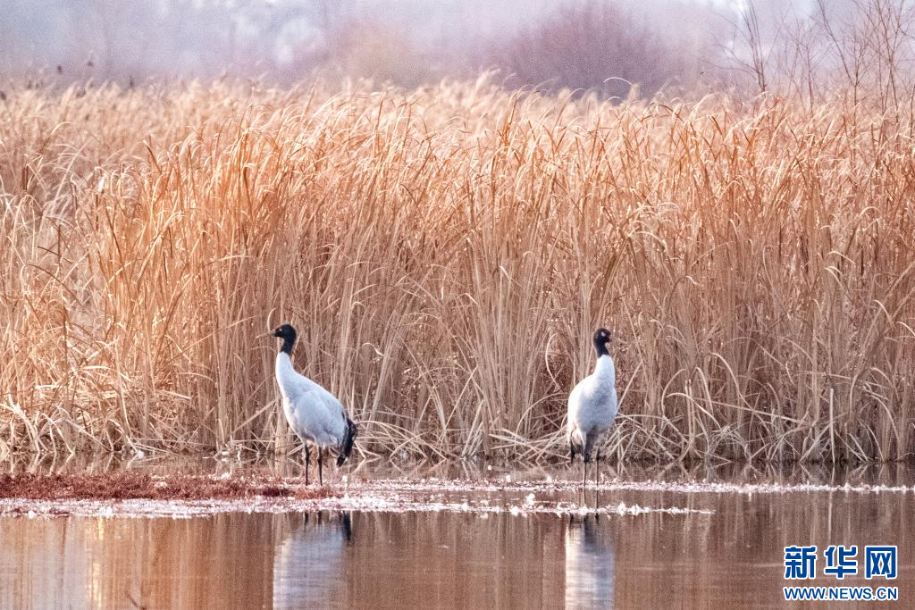 1月9日,在拉萨市拉鲁湿地越冬的黑颈鹤。新华网旦增努布摄