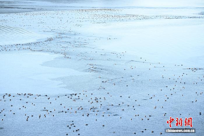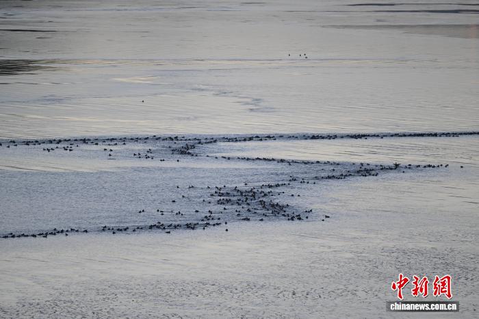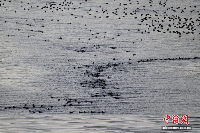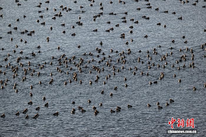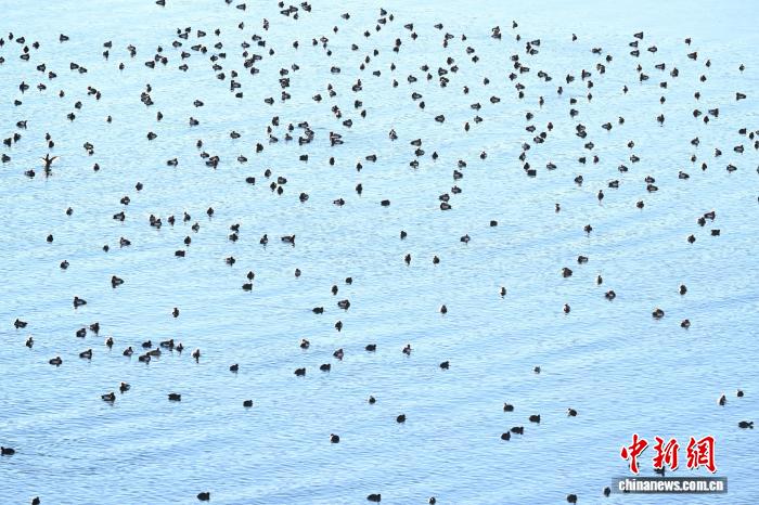 1月18日,成群的赤嘴潜鸭在沉错水域越冬。中新社记者贡嘎来松摄