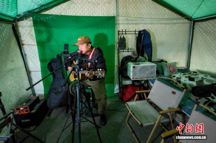 1月26日,拉萨市中华文化公园露营地,来自江苏南京的赵德春在帐篷内弹吉他、唱民谣。江飞波摄