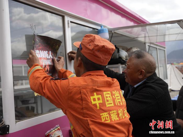 图为给商铺宣传防火知识。丹增平措摄
