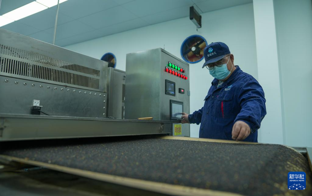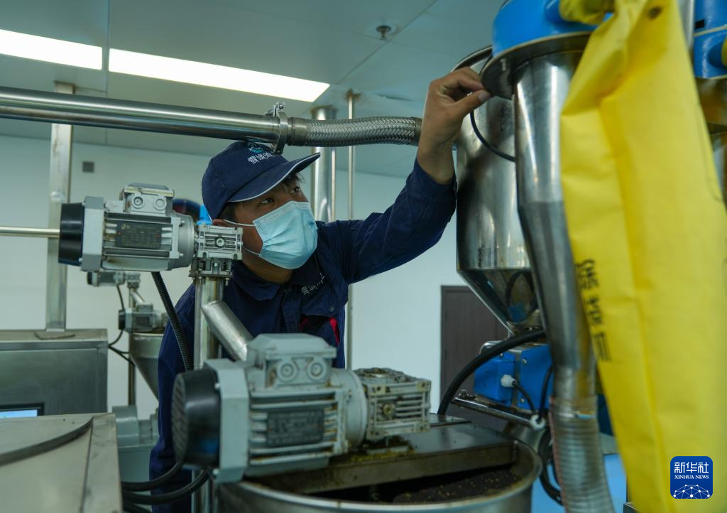 西藏山南市扎囊县重点招商引资企业——西藏纳兰生态产业有限公司工作人员操作微波烘烤设备制作食用油(3月17日摄)。新华社记者晋美多吉摄
