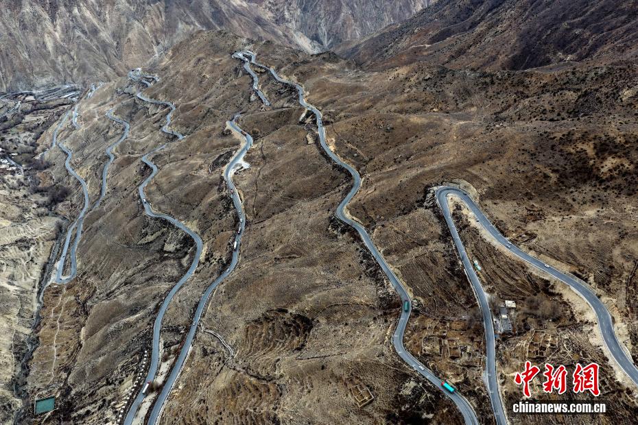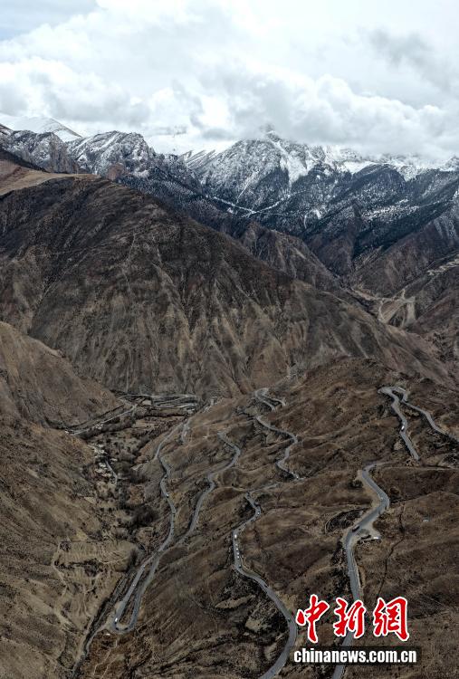 3月25日,川藏线“天路72拐”观景台拍摄的川藏公路。位于西藏昌都市川藏公路线上的“天路72拐”,全长仅30多公里,高差却达1800余米。因坡陡弯急、地势险峻成为川藏公路上极具视觉冲击力的打卡点,吸引过往游客在观景台驻足打卡拍照。(无人机照片)中新社记者李林摄