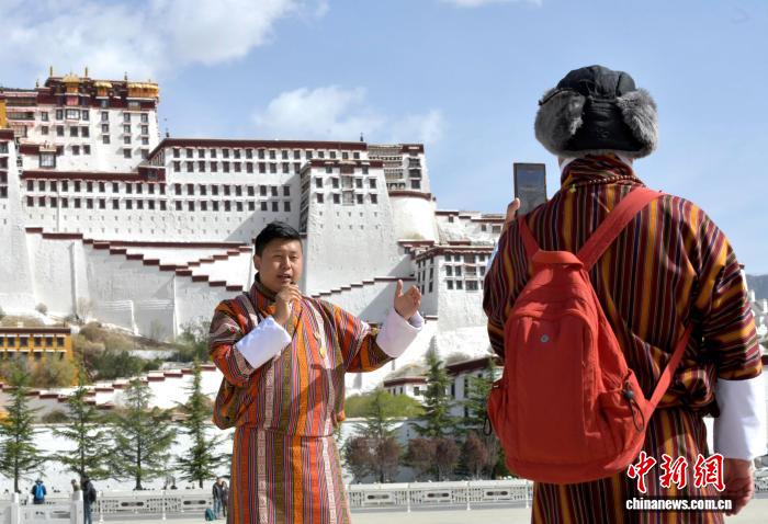 图为4月22日,来自不丹的游客在西藏拉萨布达拉宫广场拍摄视频。中新社记者李林摄