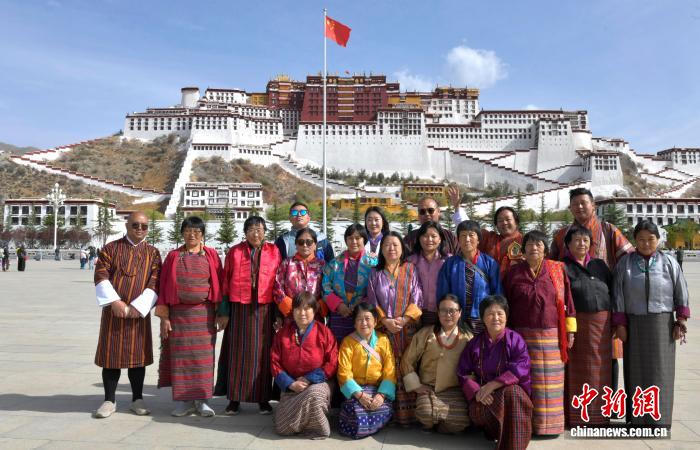 图为4月22日,来自不丹的游客在西藏拉萨布达拉宫广场合影留念。中新社记者李林摄